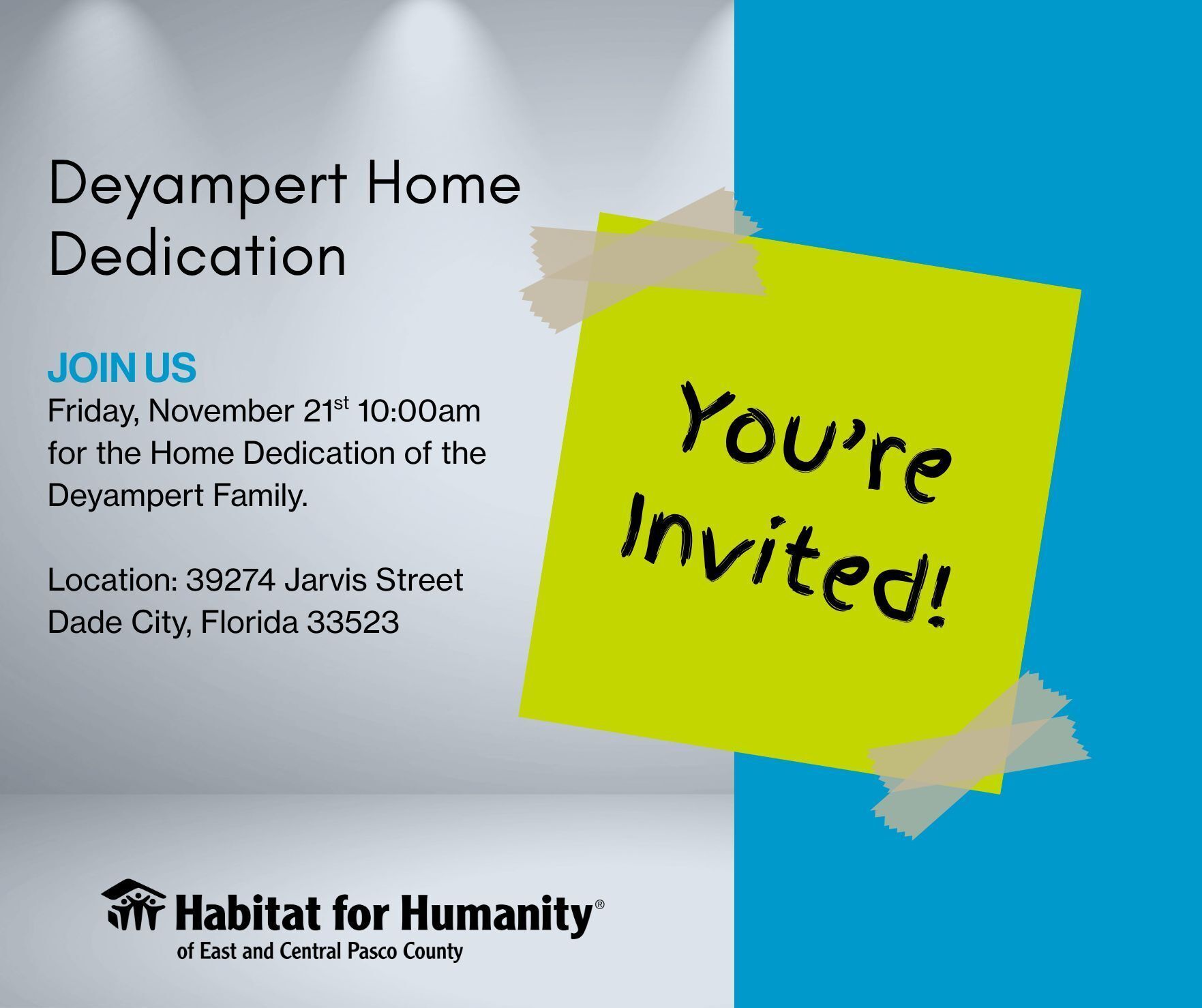 We’re excited to invite our community to celebrate a special milestone for the Deyampert Family. Their home dedication ceremony will take place on Friday, November 21st at 10:00am at 39274 Jarvis Street in Dade City, Florida.