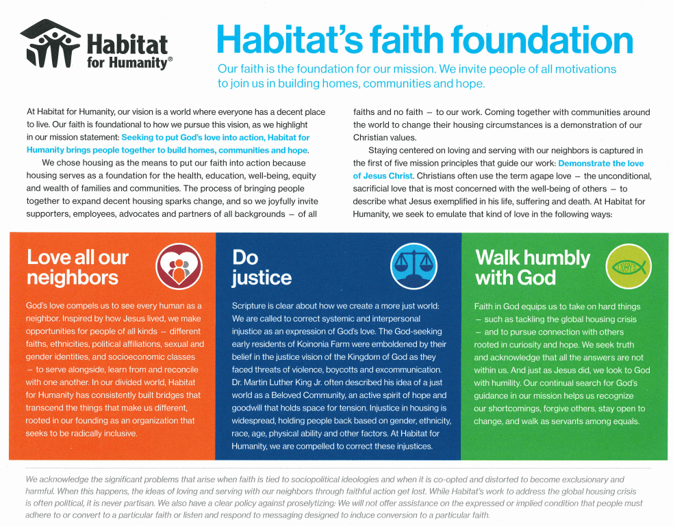 Faith in God equips us to take on hard things, such as tackling the global housing crisis, and to pursue connection with others rooted in curiosity and hope. We seek truth and acknowledge that all the answers are not within us. Our continual search for God’s guidance in our mission helps us recognize our shortcomings, forgive others, stay open to change, and walk as servants among equals.